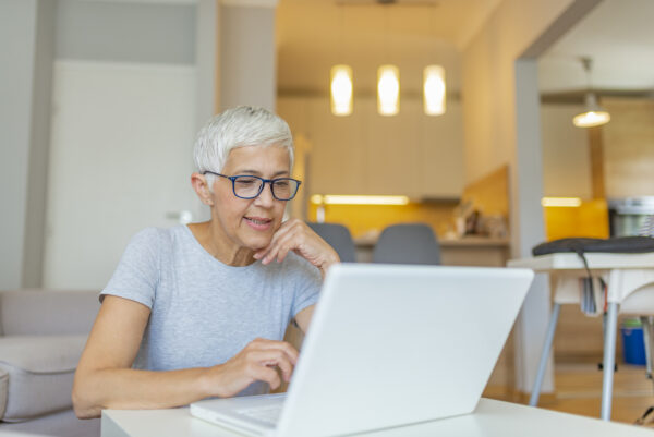 Elderly woman working on laptop computer, smiling.
